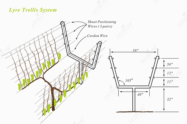 Il sistema a traliccio di Lyre, noto anche come tralicci a forma di "U", è un tipo simile alla doppia tenda di Ginevra, ma le canne sono allenate piuttosto che verso il basso, la vela superiore aiuta a difendersi dall'oidio esponendo l'uva a più vento e sole.