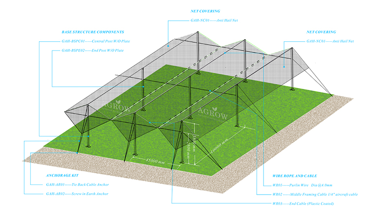 Ad AGROW offriamo diversi sistemi per la copertura dei frutteti, dal tradizionale sistema inclinato al sistema piatto. Tutti i sistemi di copertura della rete sono strutture di trazione costituite da supporti verticali collegati l'un l'altro da funi o cavi, mantenuti tesi dall'ancoraggio del cavo di ancoraggio e dagli ancoraggi a terra fissati nel terreno. La rete è posata sopra le file di piante da frutto e fissata alla struttura da hardware e accessori speciali.